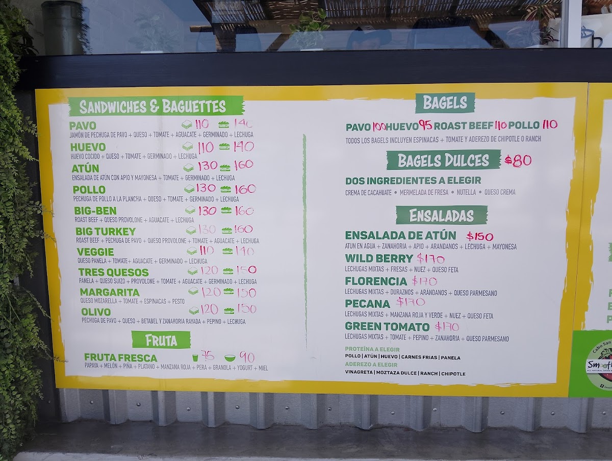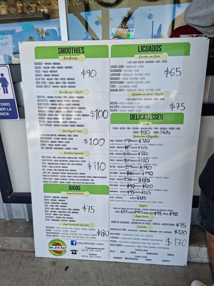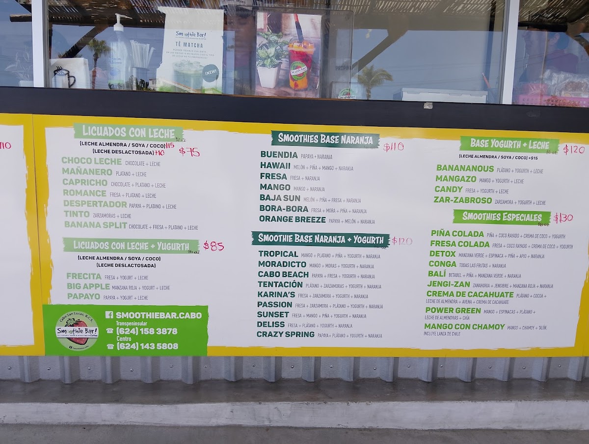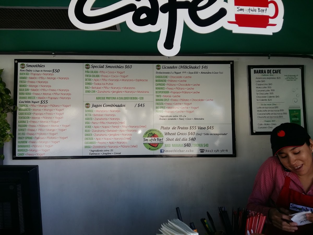 Smoothie Bar! in Cabo San Lucas offers a vibrant and refreshing menu perfect for those seeking a healthy and delicious break. The menu is filled with a variety of smoothie options, each designed to energize and satisfy. One standout is the Peanut Butter Smoothie, a creamy blend that's both rich in flavor and packed with protein, making it an ideal choice for a quick meal. For those looking for a lighter option, the Banana and Yogurt Smoothie provides a smooth, tangy taste that’s both refreshing and nutritious. If you're in the mood for something a bit more indulgent, the Capuccino is a must-try, combining a rich coffee flavor with the perfect balance of sweetness and creaminess. Each smoothie is thoughtfully crafted with fresh ingredients, making Smoothie Bar! a great place for both a tasty treat and a health-conscious choice.